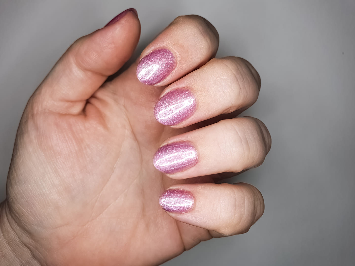 Lavender-pink. Pearl finish. Frosted. 1 coat sheer, 2+ coats opaque. Warm undertone.